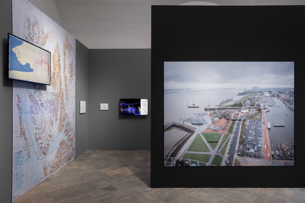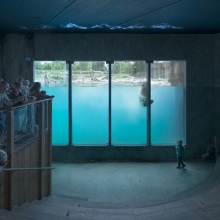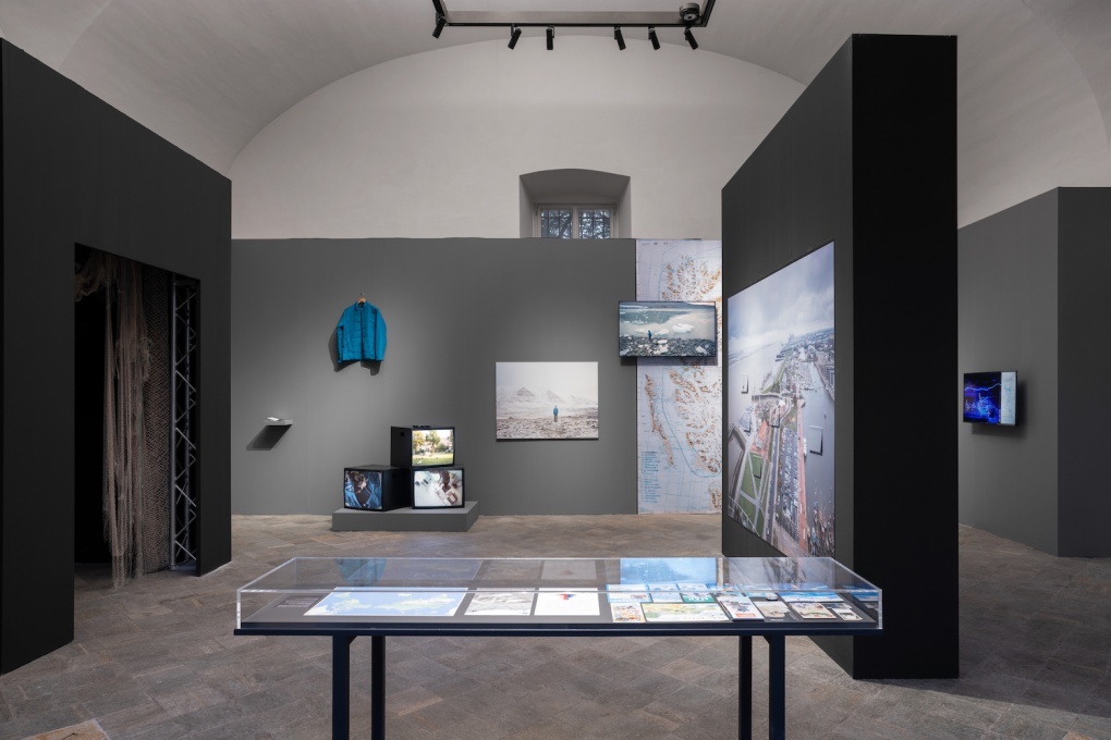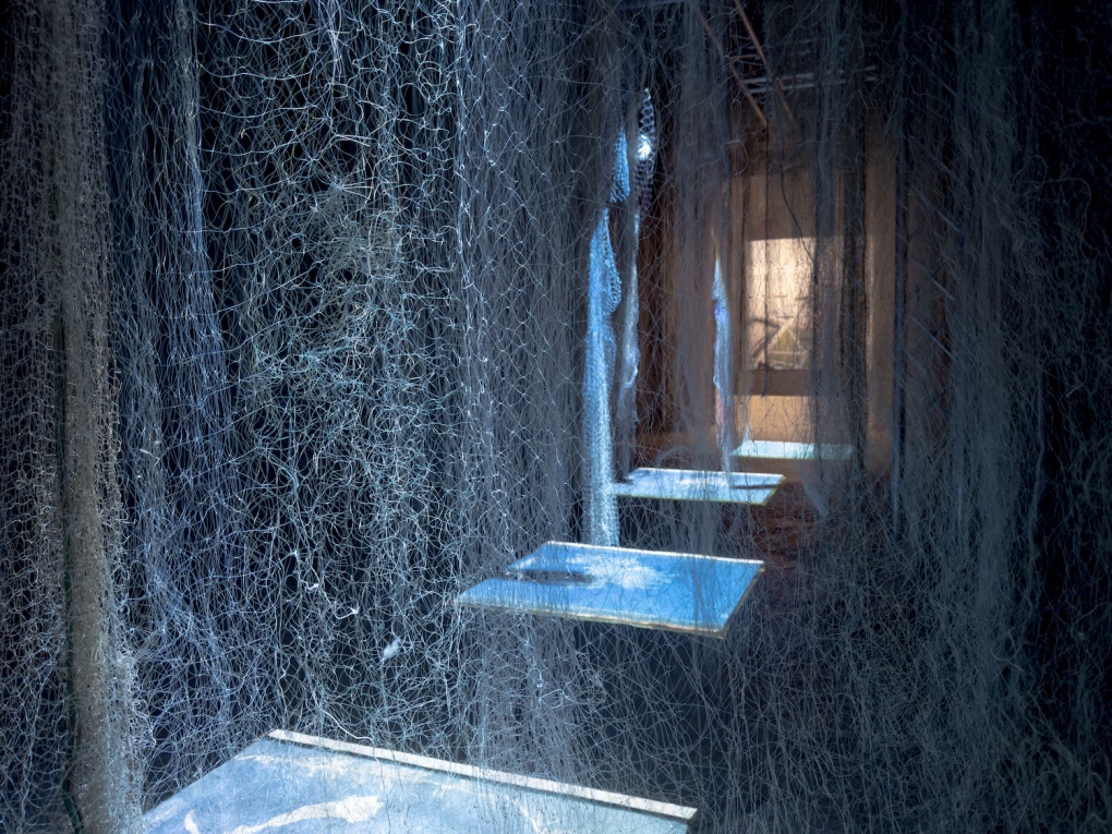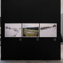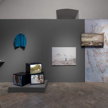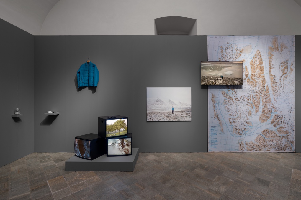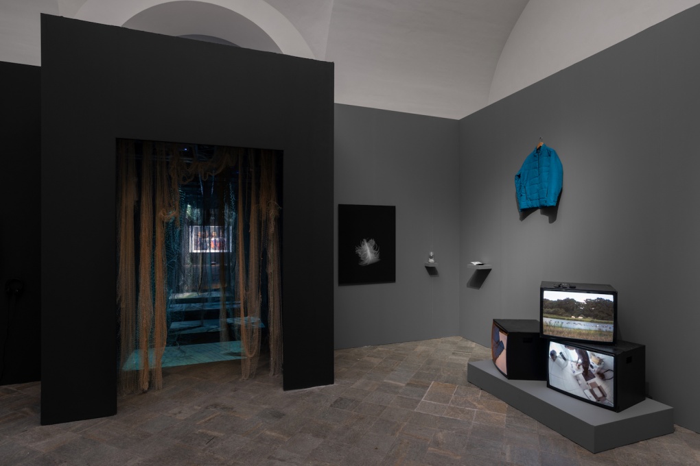 A second room plays host to two further research-based projects. The first, White Bear (2014-ongoing), examines the lives of captive polar bears in artificial enclosures worldwide, highlighting the dilemmas of ex-situ conservation and zoo management. Through photographs and videos, Lo juxtaposes images of sentient creatures with the artificial settings to which they are confined, highlighting ethological concerns surrounding captivity. The second, Down (2017-2018), traces Lo’s attempt to create a handmade down jacket from feathers he collected in the Netherlands. Testing his garment in the Arctic, Lo’s project establishes a playful commentary on the toll of mass production and the viability of homespun, sustainable alternatives.