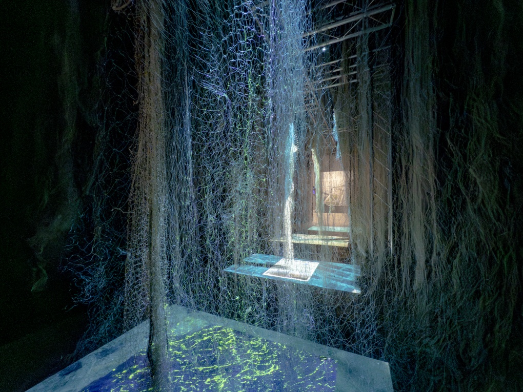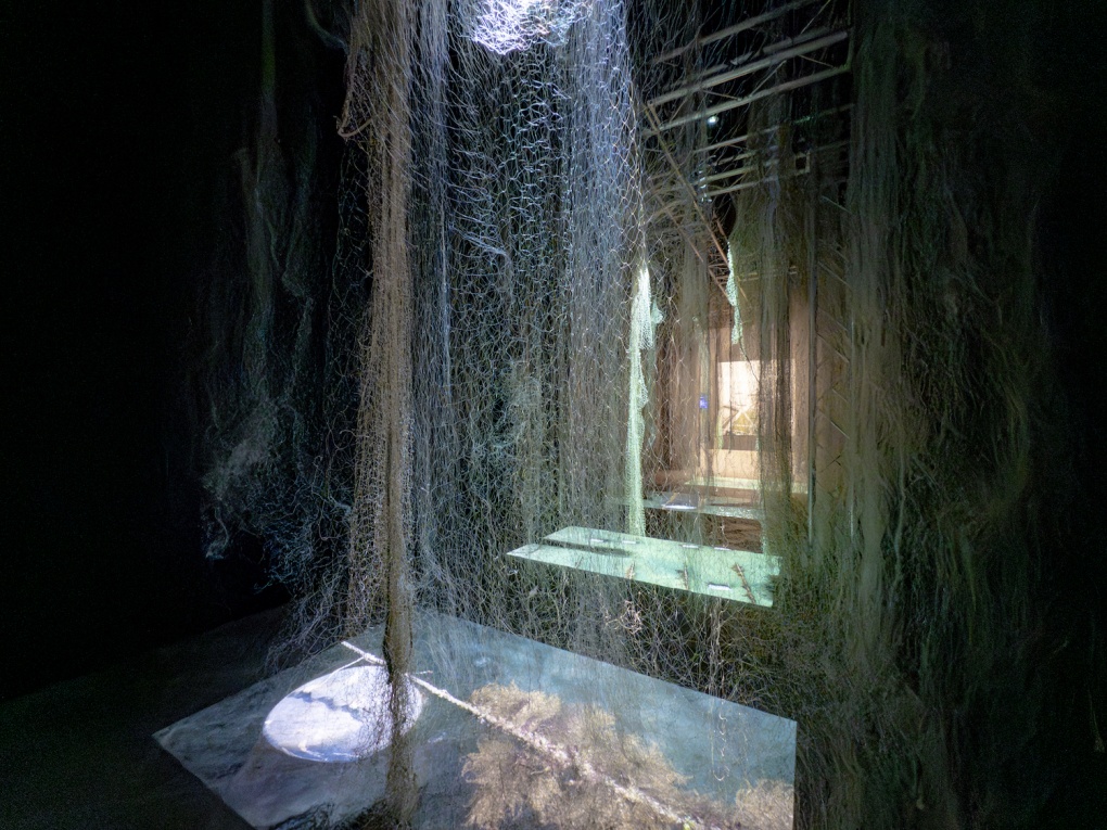 At the heart of the space is Matter of Scale (2021-2022), a video installation questioning the large-scale expansion of seaweed farming. Inspired by mainstream narratives that praise the benefits of ocean farming, Lo’s research questions its environmental and cultural complexities; celebrated as a sustainable solution in western countries, the practice’s large-scale adoption in East Asia has triggered worrying ecological disturbances such as algal blooms. Lo’s response invites audiences to reflect on both the risks and unintended consequences of scaling up ‘green’ industries, as well as how we can aspire to tread with greater care.
