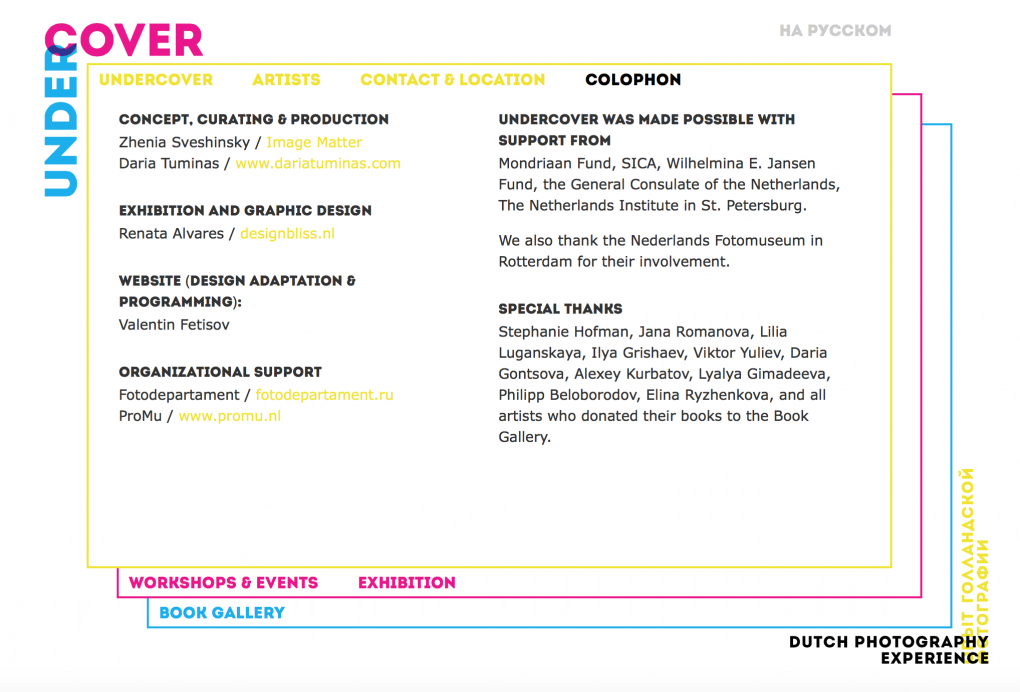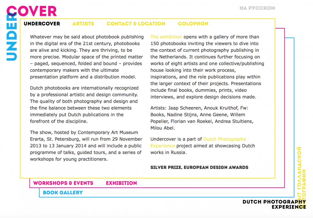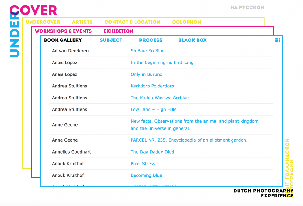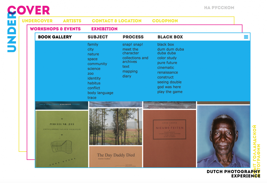 Undercover website contains all the documentation on the exhibition, as well as it works as a data base of Dutch photo books.
