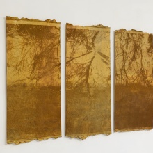 The artist made photographs from the perspective of the river itself, focusing on the meeting of water and riverbank – sometimes a natural barrier, but more often stone and concrete. On the riverbanks, Engelberts found a clay-like substance that she decided to work with, having tested it at attraction terrestre, a local ceramics studio in Arles. Where the Rhône has been subdued by hydraulic and nuclear technology, Engelberts wanted to adopt a technical and distant approach to her own way of working. Organic material and mechanical process intertwine here: the artist laser cuts photographs, creates reliefs, presses clay into them, and glazes her ceramic landscapes with clay from the Rhône.