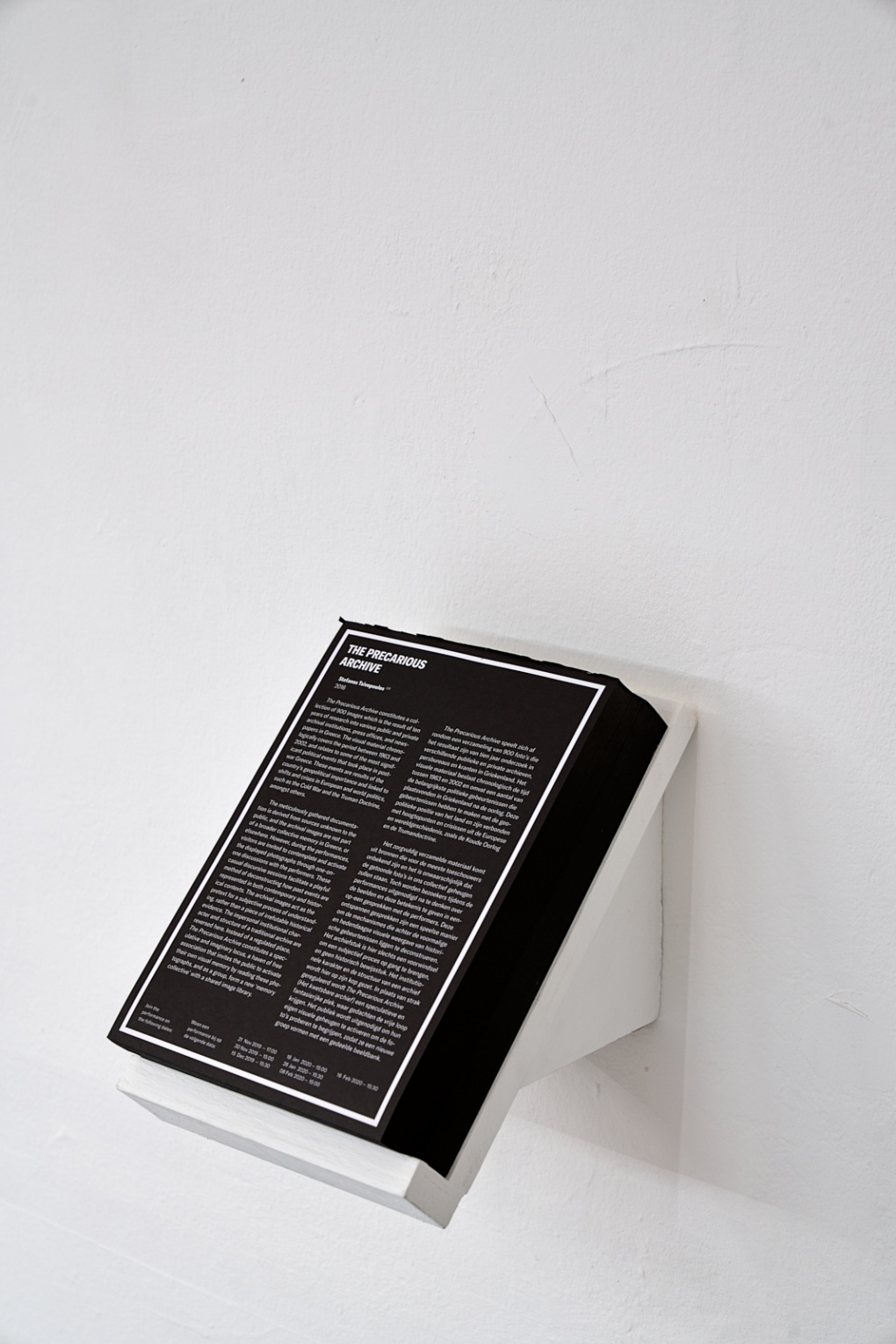 The exhibition features works by the following international artists: Parisa Aminolahi (IR, based in NL), Ana Paula Estrada (MX, based in AU), Florian Göttke (DE, based in NL), Délio Jasse (AO, based in IT), Anastasia Mityukova (RU/CH, based in NL), Lorie Novak (US), Jan Rosseel (BE), Stefanos Tsivopoulos (GR, based in US and NL), Max Pinckers (BE) & Sam Weerdmeester (NL, working in BE), Ben Krewinkel (NL).