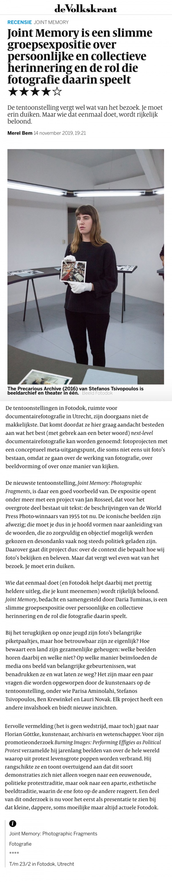 "I find it fascinating to see how differently we deal with a (historical) event. This gives a push to look at the role of (un)known media and the consequences mediation causes. Form is sometimes essential for this show, and it was strongly narrated. Very fascinating and confrontational." Visitor
