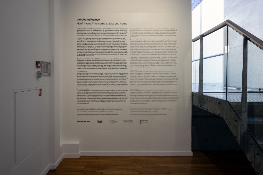 'Haufi nyana? I’ve come to take you home' presents the work of Lebohang Kganye, winner of the Foam Paul Huf Award 2022. The exhibition showcases four projects from Kganye's oeuvre, spanning the last decade. From photographic montages to spatial installations, film animation and patchwork: together these artworks emphasise the resourceful and complex visual language of the Johannesburg-based artist.