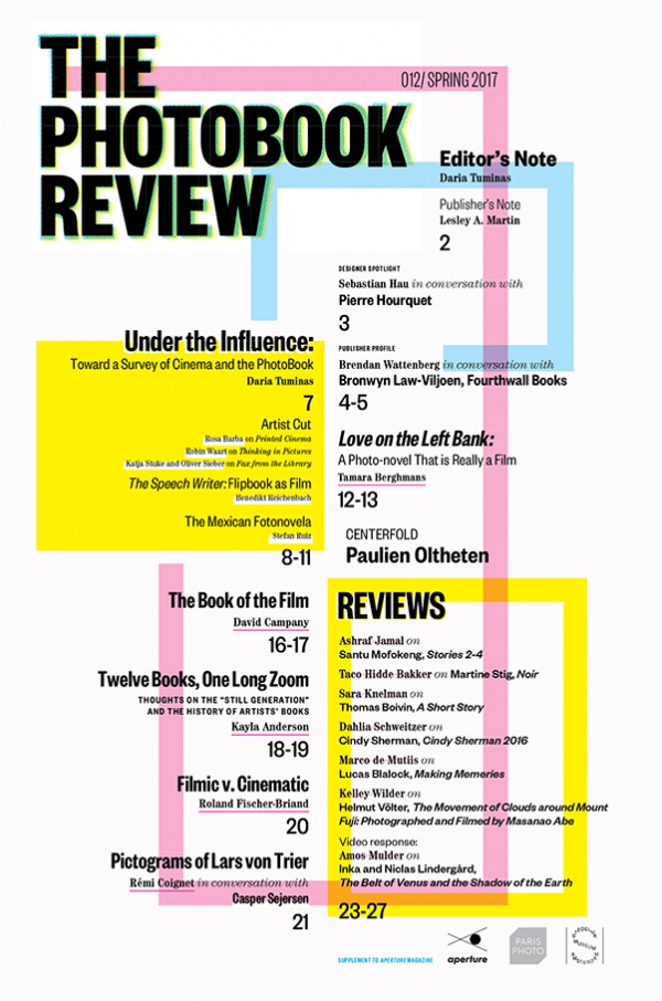 "Guest Editor Daria Tuminas assembled a group of international critics, artists, and scholars to engage with the question of what is meant by the word cinematic as applied to the photobook. In “Artist Cut,” Rosa Barba, Robin Waart, and Katja Stuke and Oliver Sieber talk about works that tackle the intersection of still images on the page or the wall and the moving image, Benedikt Reichenbach examines Ban Abidi’s multipart flipbook The Speech Writer, and Stefan Ruiz introduces a selection of Mexican fotonovelas, while David Campany looks at books that tie directly to particular films, such as Alain Resnais’s Repérages, or The Virgin Suicides: A New Generation’s Companion to Film by Sofia Coppola and Corinne Day. Additional pieces by Kayla Anderson and Roland Fischer-Briand discuss contemporary video and photobooks and the different possibilities of filmic vs. cinematic when used to describe books. For this issue’s Designer Spotlight and Publisher Profile, Sebastian Hau converses with designer Pierre Hourquet, and Brendan Wattenberg talks to Bronywn Law-Viljoen, publisher of Fourthwall Books. The Reviews section includes Ashraf Jamal on Santu Mofokeng, Marco de Mutiis on Lucas Blalock, Sara Knelman on Thomas Boivin, Dahlia Schweitzer on Cindy Sherman, and Amos Mulder’s video response to a book by Inka and Niclas Lindergård."