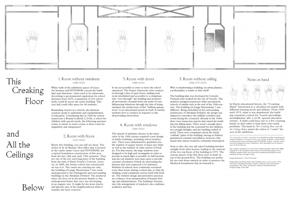 The building of Lange Nieuwstraat 7 was once a monastery, a school for children with learning disabilities, and now is occupied by FOTODOK, Casco Art Institute: Working for the Commons, two artists studios, and In De Ruimte. Spanning six centuries, the building has undergone transformations depending on its use and ownership, adapting to the times and needs of its tenants. Archival material, folklore, architectural evidence, and artistic imagination weaves a tapestry of stories about this location.
